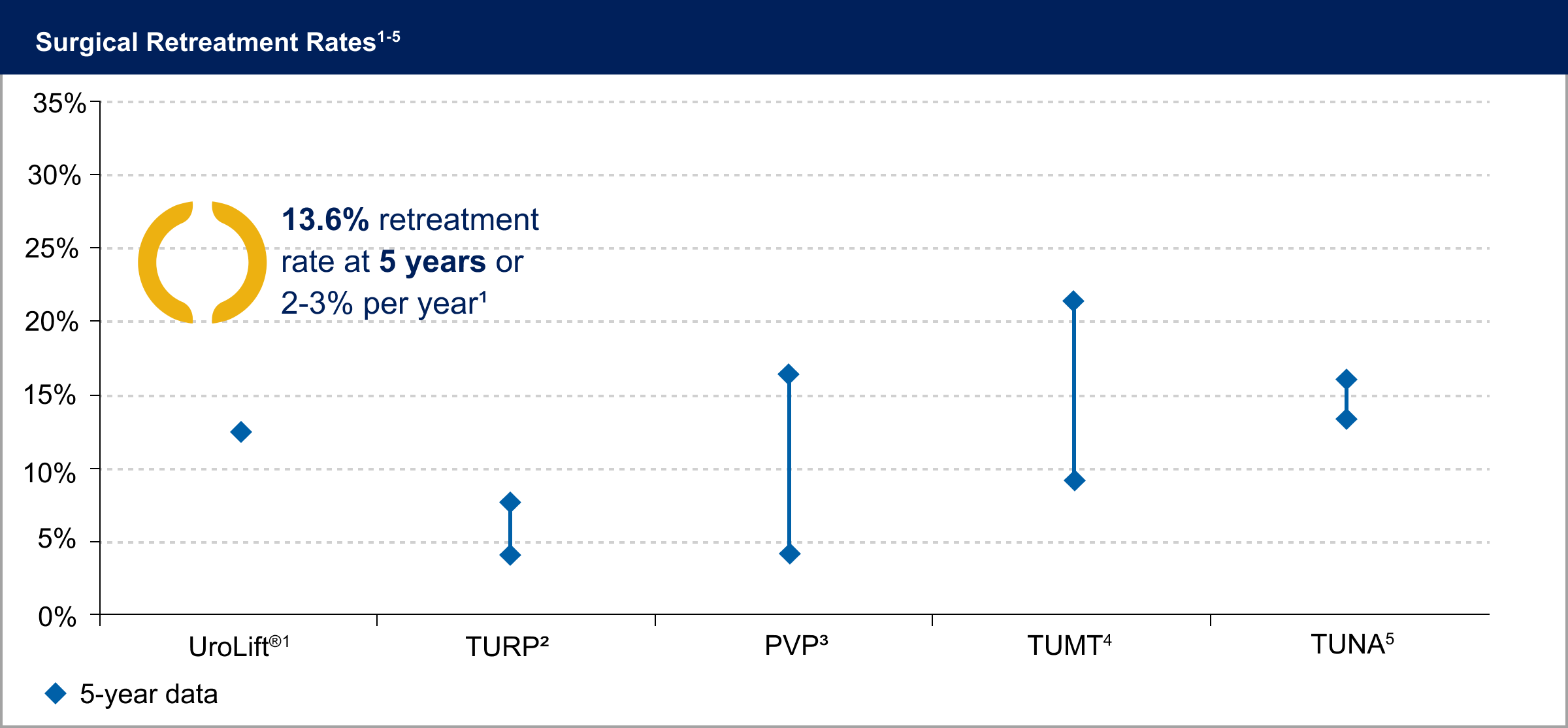 1. Roehrborn, AUA 2017 L.I.F.T. study 5 year presentation; 2. Madersbacher, Eur Urol 2005; 47: 499-504; 3. Yasushi, J Endourol 2016 ; 4. 5-year TUMT data – Mynderse, J Uro 2011; 5. 5-year data for TUNA, Hill, J Urol, 2015